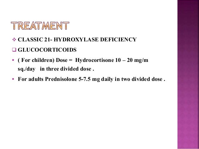There are currently limited trials comparing the efficacy and safety of different glucocorticoid replacement regimens for treating 21-hydroxylase deficiency CAH in children and adults and we were unable to draw any firm conclusions based on the evidence that was presented in the included trials. This results in 1 impaired cortisol biosynthesis and adrenal insufficiency and 2. Treatment for 21-hydroxylase deficiency depends on the severity of symptoms and the form of the condition.